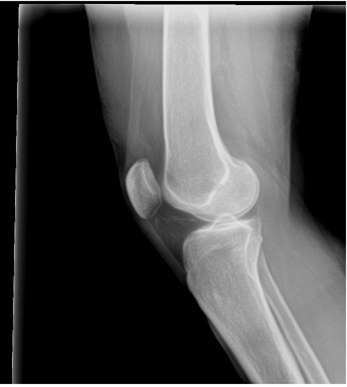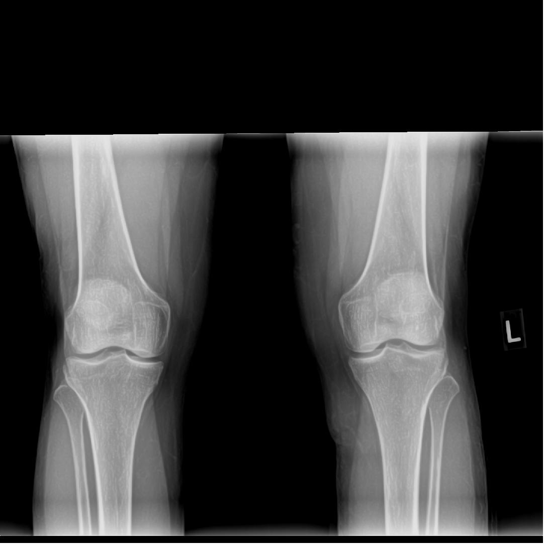 His interpretation of x-rays: “There is a slight wedge on the lateral aspect of her left knee in the joint space. The left tibia shows anterior rotation on the the AP view. The left fibula has mild lateral displacement. There are no remarkable findings of degeneration. There are no remarkable findings on the right knee.”